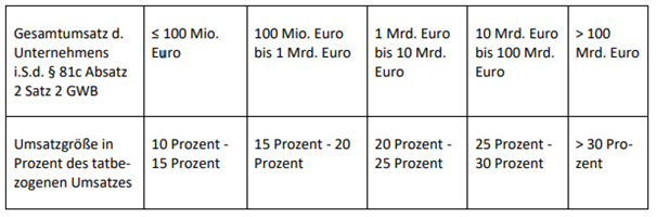 Dieser Ansatz wird nun durch die zunächst relativ statische Bestimmung der sog. Umsatzgröße ersetzt. Dabei handelt es sich um einen innerhalb bestimmter Spannweiten fixierten Prozentsatz des tatbezogenen Umsatzes; dieser Prozentsatz wird anhand des Gesamtumsatzes der unternehmerischen Einheit mittels folgender Tabelle bestimmt.