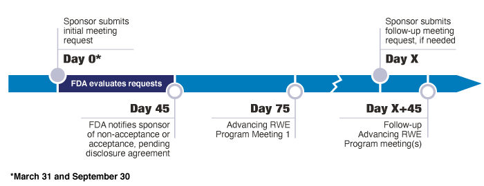 The semi-annual submission deadlines for initial meeting requests to the Advancing RWE Program are March 31 and September 30. FDA will review all meeting requests received in the preceding 6 months after each submission deadline. FDA provided the following infographic depicting the pertinent timelines in the application process: