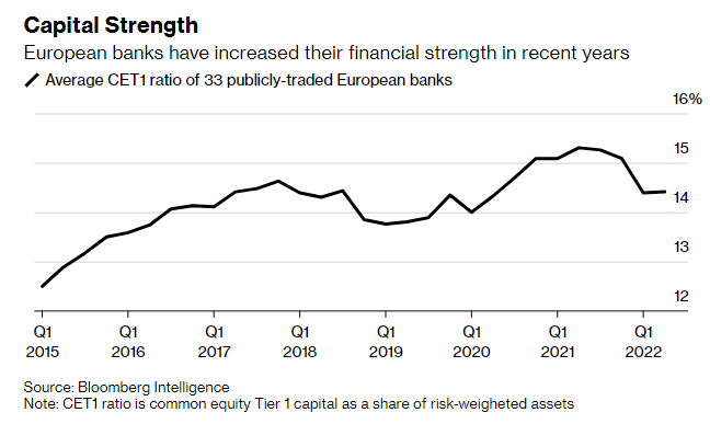 European banks have slowly been growing their common equity tier capital to sustain larger shocks and have therefore significantly enhanced their capital strength over the last couple of years, as illustrated by the below table:
