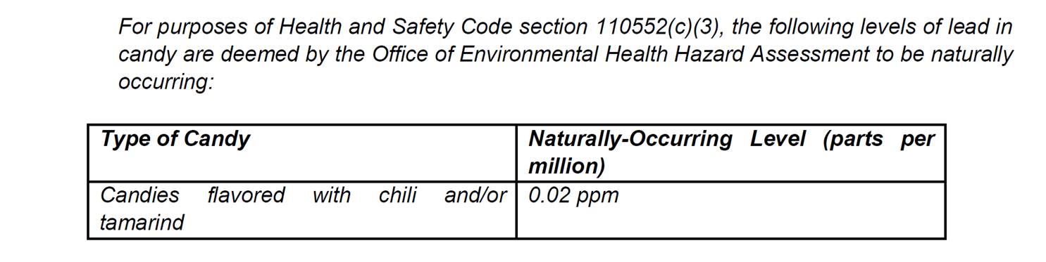 Under California’s Health and Safety Code section 110552, OEHHA is proposing to establish naturally-occurring lead levels in candies containing chili and tamarind at 0.02 ppm. 7 The proposed regulatory text is copied below: