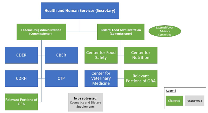 - Option A – Create separate Food and Drug Administrations within HHS. This option would separate the FDA into two administrations: the Federal Drug Administration and the Federal Food Administration, each with a Commissioner reporting directly to the HHS Secretary. The Panel notes that the structural changes presented in this option would likely require Congressional action.
