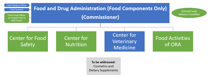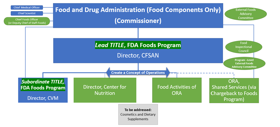 - Option C – Establish CFSAN as overall lead for the FDA Human Foods Program. This option would consolidate the Program under the Director of CFSAN with the Center for Veterinary Medicine (CVM) Director as the deputy for the program.4 However, the CVM Director would still report on non-food-related activities directly to the FDA Commissioner. It would also establish a Chief Foods Officer in the Office of the Commissioner who would, “coordinate response to outbreaks and cross-Agency food issues, medical foods, biotech, etc. and serve as the lead for cross-Government food-related activities.”