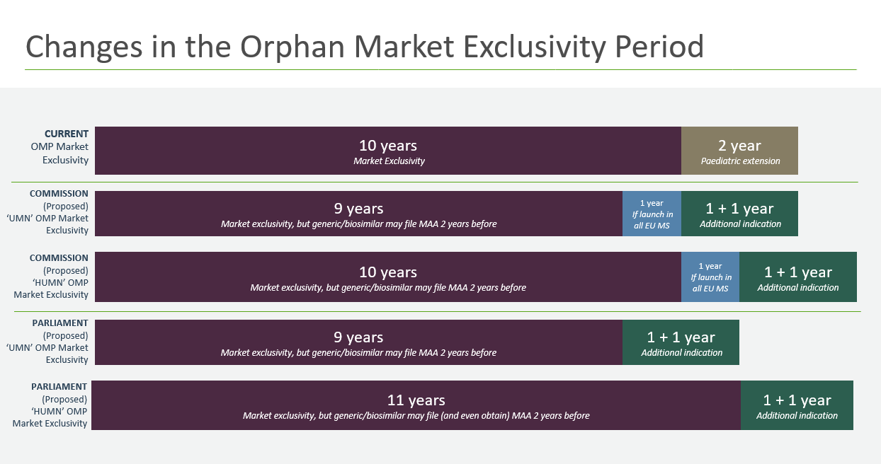 The European Parliament suggests orphan market exclusivity of 11 years for products addressing a “high unmet medical need” (HUMN), which is longer than the ten years proposed by the European Commission.
