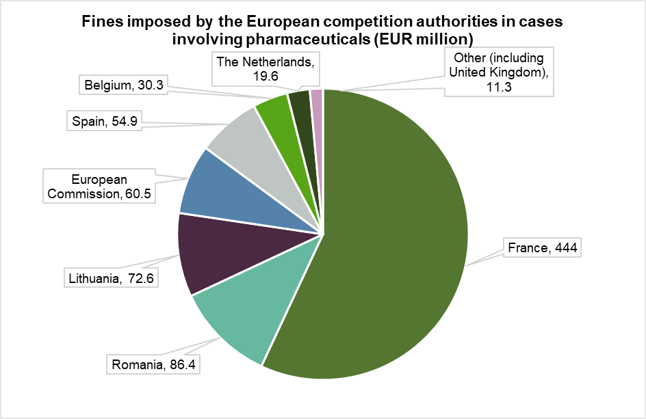 Between 2018 - 2022, fines close to EUR 780 million were imposed in pharmaceutical cases, with the EU Member State competition authorities being particularly active: the French authority alone being responsible for over half the total amount (EUR 444 million), and the European Commission imposing only EUR 60.5 million in fines (lower than the amount of fines imposed by the Romanian (EUR 86.4 million) and Lithuanian authorities (EUR 72.6 million), and only slightly higher than the fines imposed by the Spanish authority (EUR 54.9 million)). While fines issued by the European Commission made up 55% of the total fines issued between 2009-2017 (EUR 590 million), in the latest report covering the period between 2018 and 2022, they make up a meagre 8%.