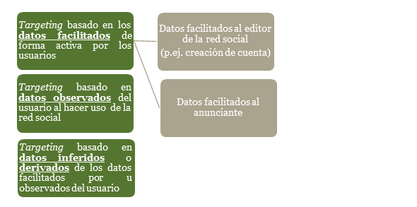 El CEPD parte del siguiente esquema de targeting o publicidad dirigida, en función de cómo se obtienen los datos personales: (i) aquellos que directa y activamente facilita el usuario; (ii) los que se obtienen indirectamente vía el uso que se hace de la red social; o (iii) los que se infieren y generan los anunciantes o editores sobre la base de las categorías anteriores.